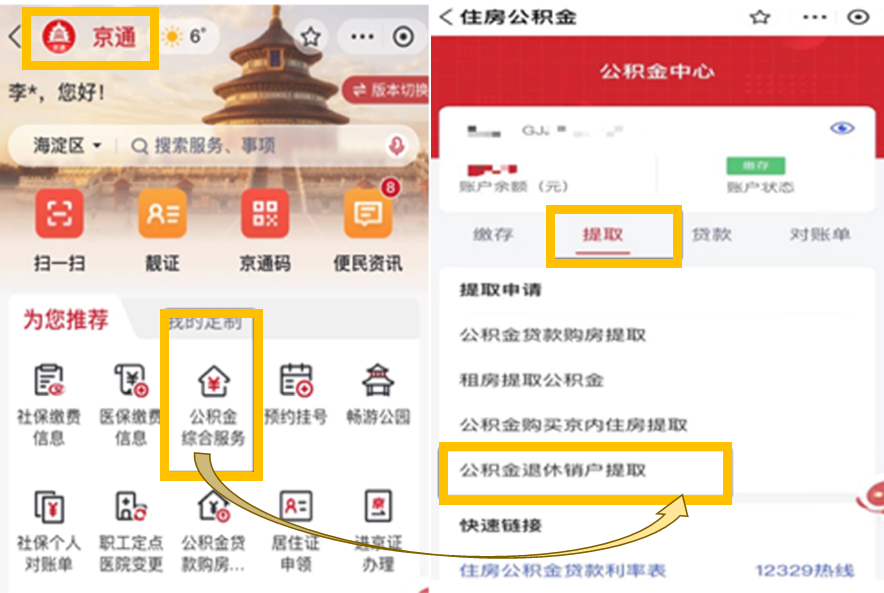 打开 “支付宝APP”→搜索“京通小程序”→“公积金综合服务”进行身份认证→ 选择“提取”→“公积金退休销户提取”,按照提示录入相关信息。