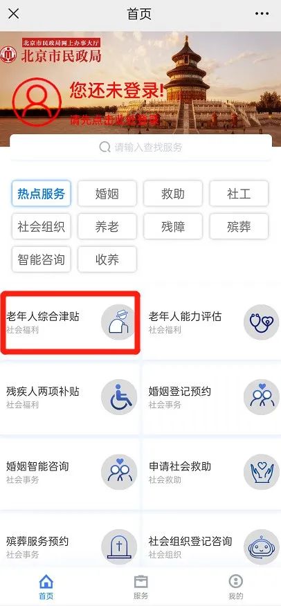 或者通过“北京民政”微信公众号-掌上服务-老年人综合津贴,点击登录申请。