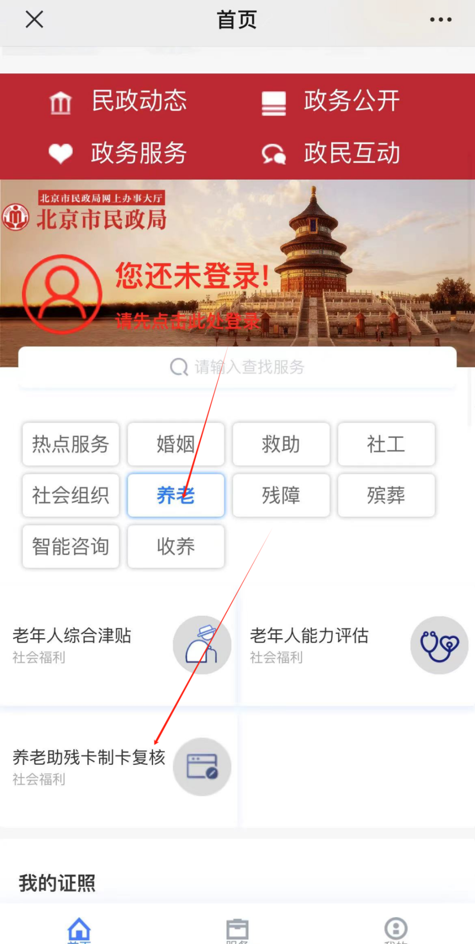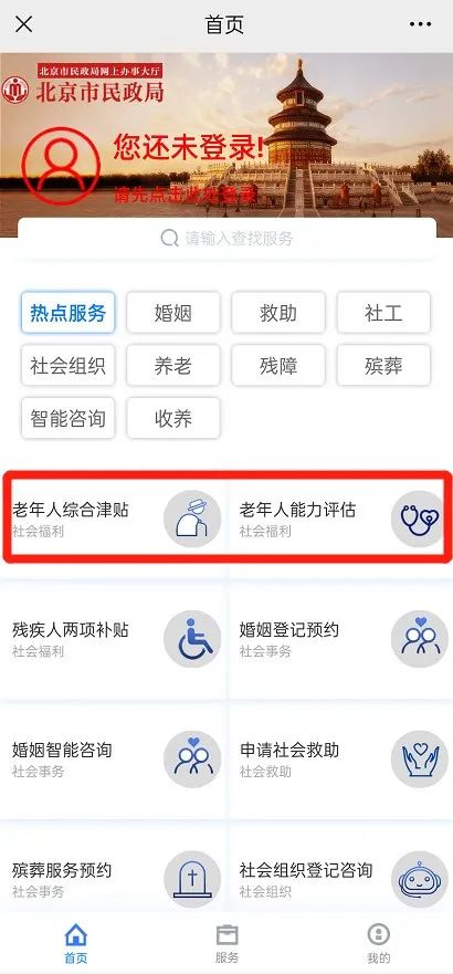 或者通过“北京民政”微信公众号-掌上服务-老年人能力评估或老年人综合津贴,点击登录申请。