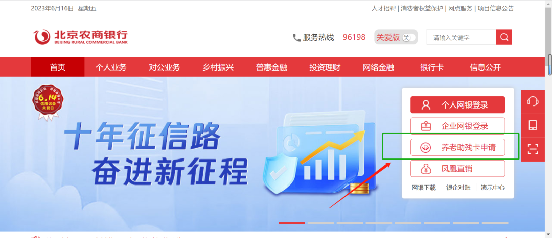 (3)也可通过“北京农商银行e服务”微信公众号,e服务-更多功能-全部功能-养老专区-养老助残卡申请/查询,进行办理。