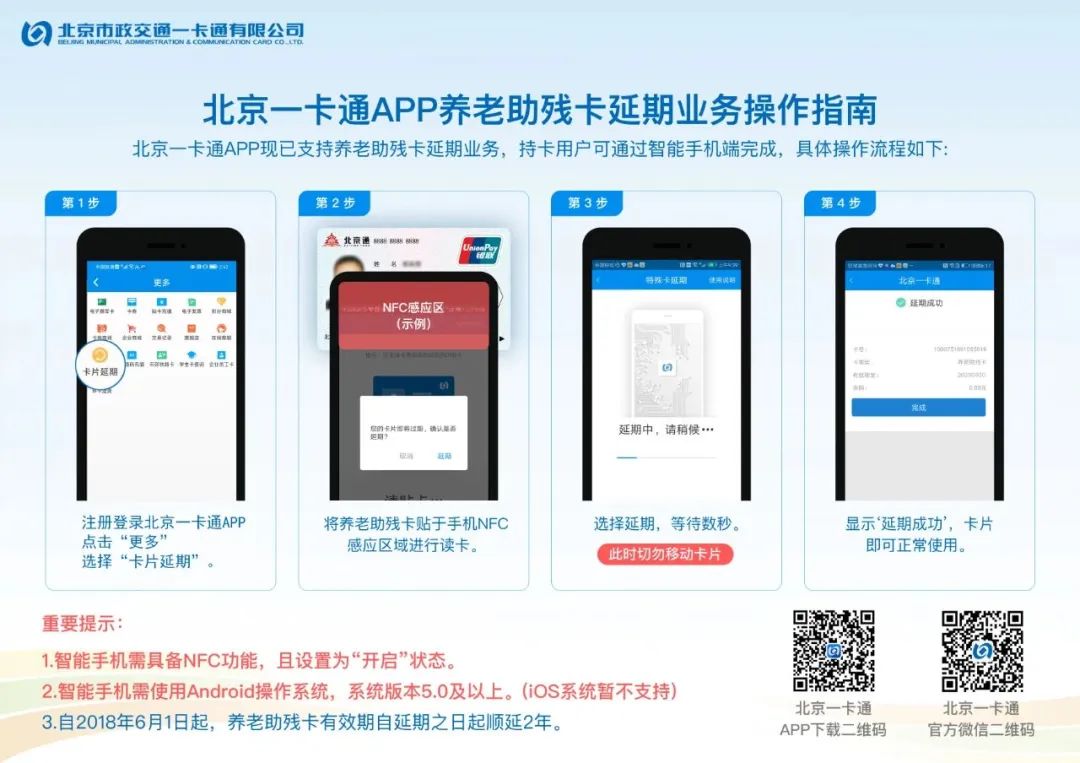 温馨提示:在线办理北京通·养老助残卡延期业务时,用户需使用具有NFC功能的安卓手机,苹果用户暂时无法使用iPhone对卡片进行贴卡延期操作。