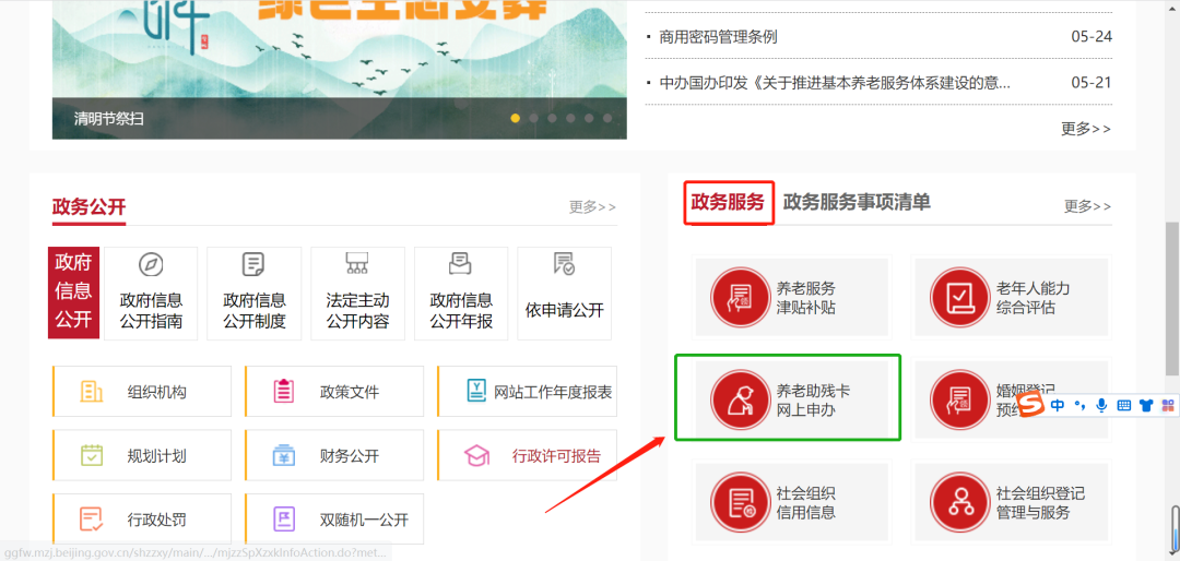 (2)或登录北京市民政局官网首页(http://mzj.beijing.gov.cn/)点击“养老助残卡网上申办”,根据要求,上传制卡信息。