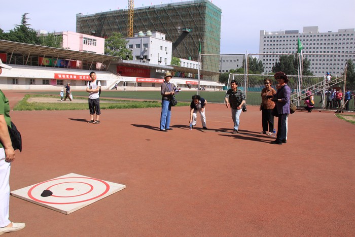 离退休教职工运动会的比赛项目都是根据老年人的特点设置的,项目运动量小、强度低,以娱乐为主,竞赛为辅。共有400余人次参加了10个项目的比赛。足球射门虽然是小球门、近距离,同样充分展示了运动员们的精准脚法;踢毽子的运动员凭着娴熟灵活的技术,把小小的毽子踢得上下翻飞;打地靶是专门为老年人设计的竞赛项目,但见运动员们频频出手,将一只只沙包投向数米外的圆形地靶上的得分区;投镖是发源自英国酒馆里的一项娱乐性极强的运动项目,在这露天操场上,运动员们因陋就简,投掷飞镖,玩得也很开心;地滚球项目也是从保龄球演变而来的,正规的球道被橡胶跑道代替,保龄球瓶被灌了水的矿泉水瓶代替,沉甸甸的保龄球变成了轻巧的小皮球,只见圆圆的皮球被运动员们迅速滚向前方的六只塑料瓶,球到之处,或击中几只球瓶而引起一阵欢呼,或偏出球道一只未中引来一片惋惜;门球过门是门球运动的一项基本技术,看似简单,然而小小的球门、独特的球棒和击球方法却使许多想在这个项目上一展身手的运动员们欲过球门而不能;投篮,亦是小篮板、小篮球,适合老年人的身体特点;猜猜看和夹乒乓球都是为70岁以上的老人设置的,虽然是传统项目,可是参加这两个项目的运动员们依然是兴致勃勃,玩得不亦乐乎;健身走,是所有项目中场地最大的项目,是执行规则最严格的项目,也是竞争性最强的项目,参加健身走的运动员个个都是“神行太保”,他们健步如飞,争先恐后,这个项目的裁判员们更是严格执法,保证比赛公平有序地进行。