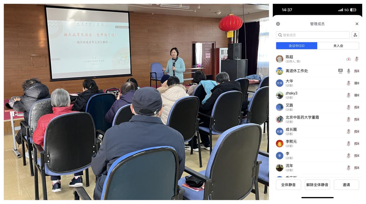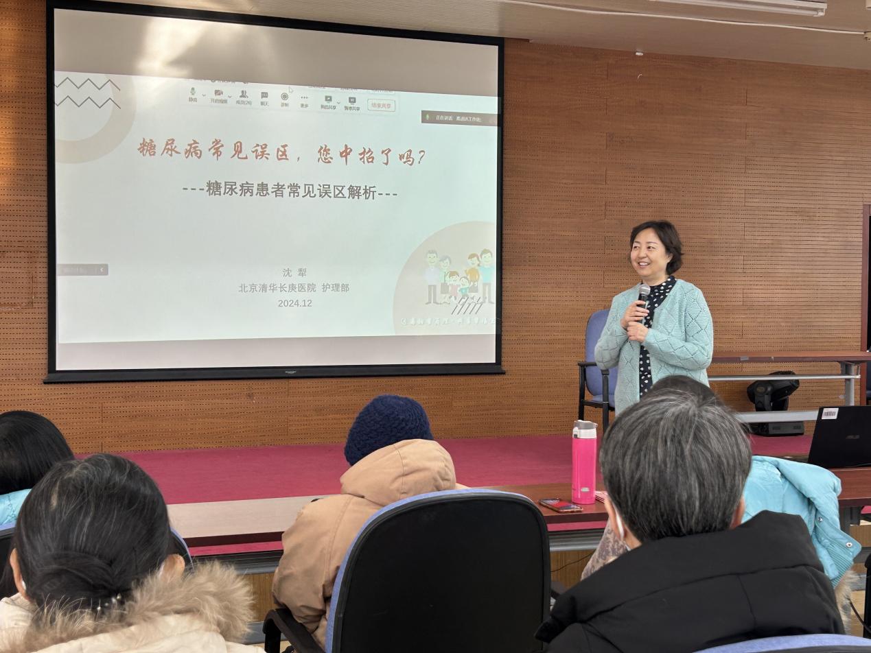 为帮助离退休教职工提高慢性病防治健康素养,拥有更加健康的晚年生活,12月26日下午,我校为离退休教职工组织银龄学堂系列活动之慢病管理系列讲座,邀请北京清华长庚医院主任护师沈犁做《糖尿病几个误区,您中招了吗?》专题讲座,为老同志揭开糖尿病认知上的迷雾,帮助大家走出误区,用科学的方法守护自己的健康。本次活动采用了线上与线下结合的模式,共40余名离退休教职工聆听了讲座。