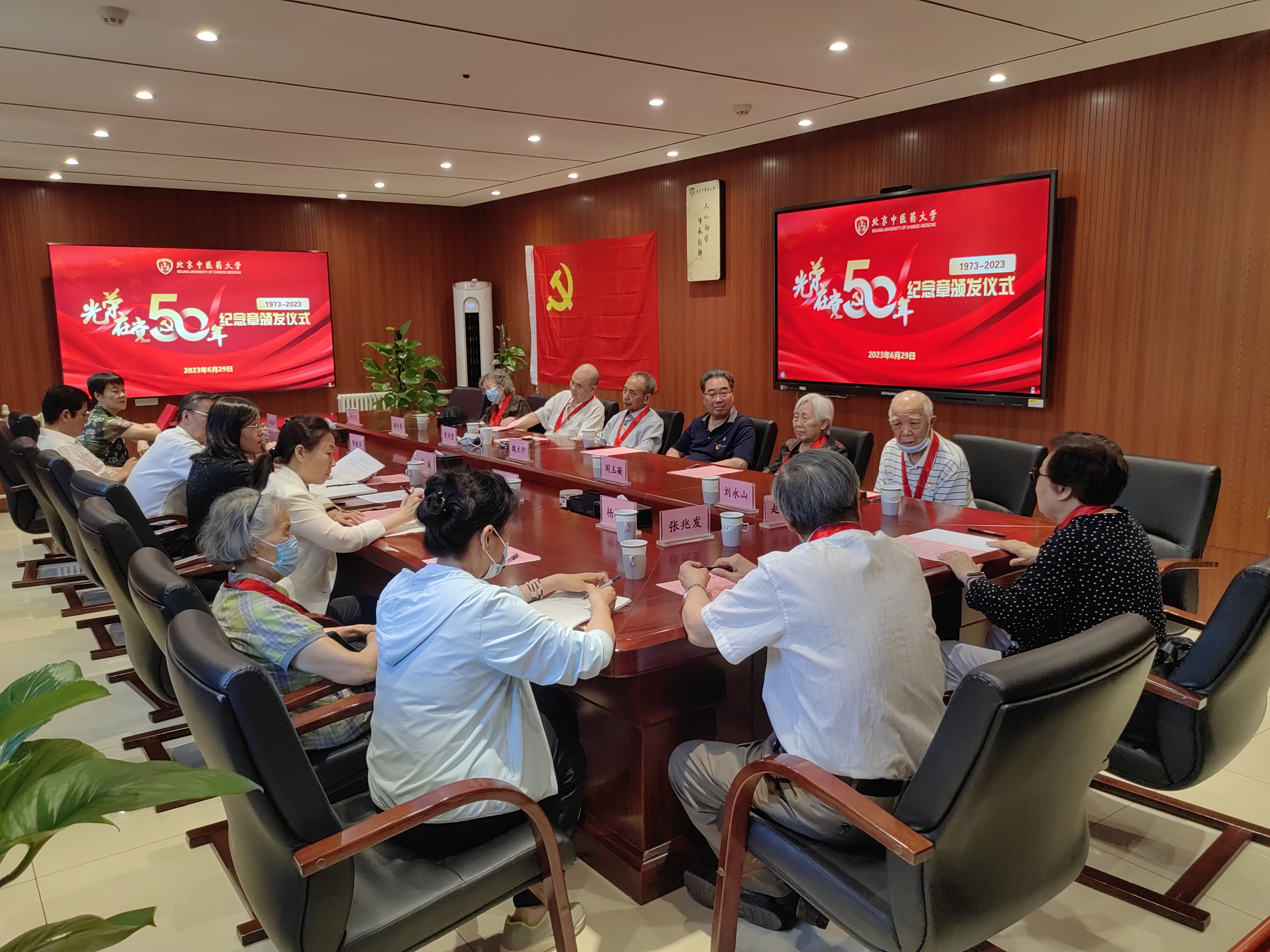 2023年6月29日上午,我校在和平街校区学七楼301会议室举行“光荣在党50年”纪念章颁发仪式。出席仪式的有:获得纪念章的老党员代表,副校长陶晓华,组织部常务副部长李彧,离退休党委书记张晓东,离退休工作处副处长乔庆彬,特邀党建组织员郭振华等同志。纪念章颁发仪式由李彧主持。