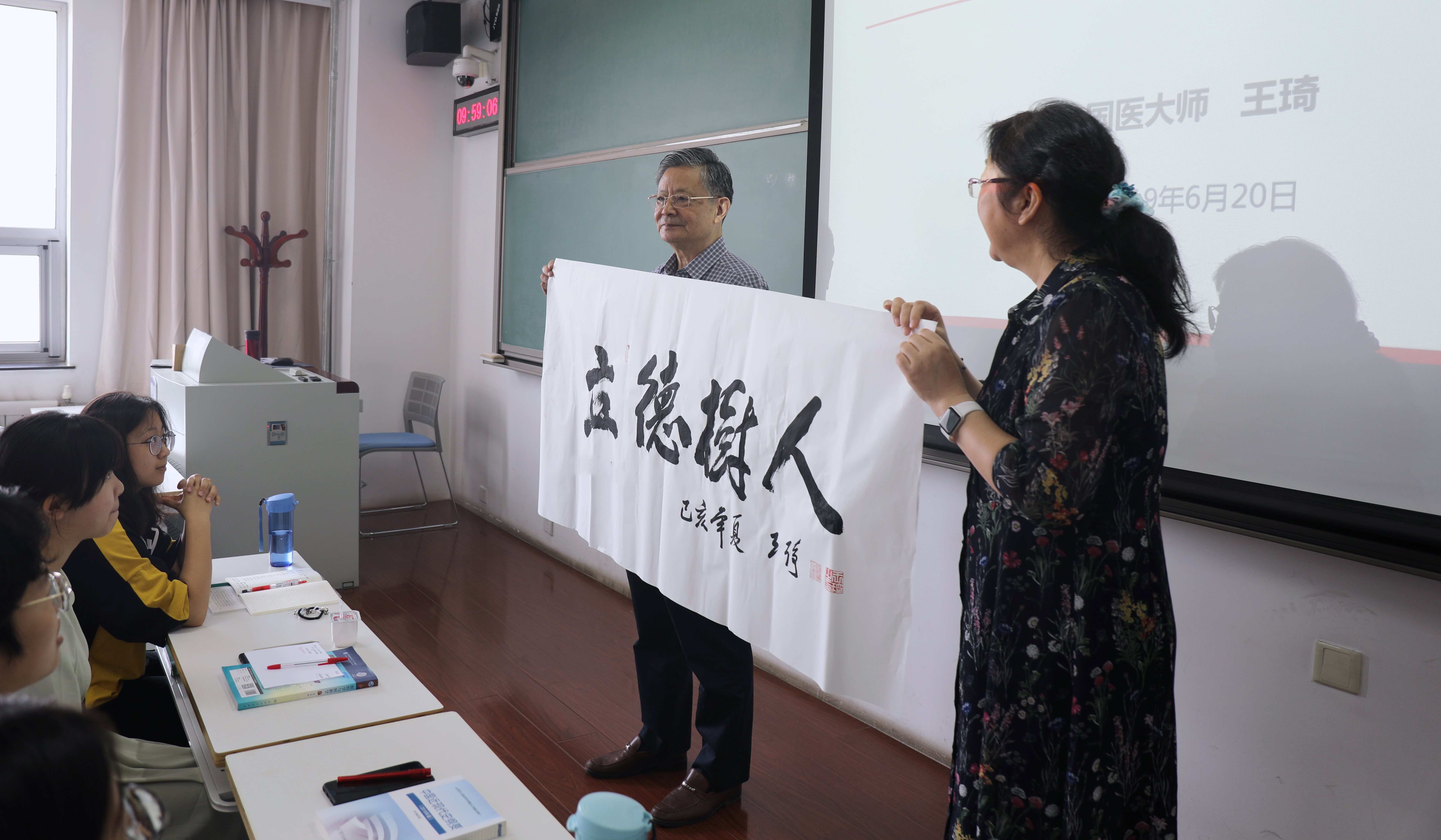 在课堂上,王琦教授从中医文化价值、中医文化内涵与中医文化转型等方面进行了深入浅出的讲授。他以深刻解读习近平总书记关于中医药学是“打开中华文明宝库的钥匙”重要论述开篇,通过古今中外的多样事例,展现出中医学所承载的中国绵延数千年的厚重积淀,充分展示了中医学以其原创性、完整性和领先地位在历史长河中熠熠生辉。他详细讲解了中国古代的伟大创造成果——针灸疗法与《黄帝内经》《本草纲目》,以及他创立的中医体质学在当代社会的卓越贡献。王琦教授通过妙趣横生的历史故事向大家生动讲解了中医“坐堂”说法与成语典故“橘井泉香”“杏林春暖”的来历,并结合典型病例,展现了中医在治病救人方面的显著功效。他还从历史的、理论的角度鞭辟入里地分析了中医学根植于中国历史与传统文化之中,他期盼同学们能够认识历史,感悟历史,牢固树立文化自信,并以此为基石去创造历史,推动历史发展。课堂间隙,王琦教授展示了为马克思主义学院的题字——“立德树人”,勉励大家要把对中医医学知识的学习和对“大医精诚”思想的领悟、对社会主义核心价值观的领悟结合起来。