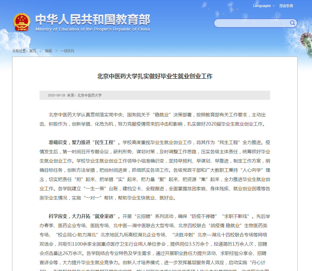 8月26日,教育部网站报道我校今年毕业生就业创业相关工作系列举措,全文如下