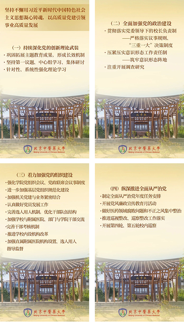 王瑶琪书记强调,一要坚持党的全面领导,增强政治凝聚力和发展自信心,走好中医药特色世界一流大学建设之路。坚持以政治建设为统领、以思想建设为指引、以组织建设为基础、以制度建设为保障,找到推动北中医事业高质量发展的“金钥匙”,以高质量党建引领高质量事业发展。二要坚持“三位一体”统筹发展,深化体制机制改革,为新质生产力提供创新动能。优化人才培养模式,为发展新质生产力夯实人才基础。加快原创性科技创新,为发展新质生产力提供新动能。统筹完善人才引育并举机制,为发展新质生产力提供核心要素。推动产学研用一体化,为发展新质生产力提供全链条支撑。切实推进通专结合、科教融合、医教融合、产教融汇,探索建立医、工、理、文多学科交叉的科研创新体系,深入推进新时代人才强国战略,形成全方位开放式的办学模式。三要坚持事业为上、强化砥柱锻造,以高素质专业化干部队伍保障高质量发展。全体党员干部要提升政治站位,擦亮忠诚坚定的政治底色。要勇于攻坚克难,擦亮担当作为的能力底色。要保持一身正气,擦亮干净清廉的作风底色。紧跟时代发展步伐,不断提升自我政治素养、理论水平、专业能力与实践本领,真正做到“功成不必在我,但成功必须有我”。