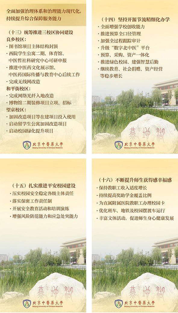 三要全面加强治理体系和治理能力现代化,持续提升综合保障服务能力。统筹推进三校区协同建设。坚持开源节流精细化办学。扎实推进平安校园建设。不断提升师生获得感幸福感。